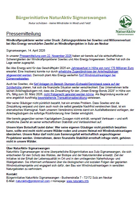 Zahlungsprobleme bei Sowitec und Millionenverlust bei Abo Energy verschärfen Zweifel an Windkraftprojekten in Sulz am Neckar. Wer seine eigenen Gläubiger nicht pünktlich bezahlen kann, sollte erst recht nicht unsere Wälder roden und unsere Heimat mit Windindustrieanlagen überziehen. Unsere Natur darf nicht zum Sanierungsfall wirtschaftlich angeschlagener Projektierer werden. Unternehmen, deren finanzielle Stabilität ernsthaft infrage steht, gehören nicht in unsere Wälder.